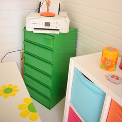 After years of being stuck in the spare room, it is so lovely to have huge sliding doors open to the fresh air and (occasional) sunshine, the light is fab now everything is a fresh white (it's all very well insulated now too). I also get to use my mums fantastic 1970s green plastic drawer unit for my filing. This piece has travelled all around with both me and my mum, and is considered a funky family heirloom now.