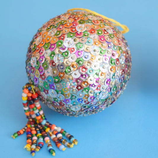 Vintage 1970s Christmas Baubles / Decorations x2 - Pink Flocked / Rainbow Sequin