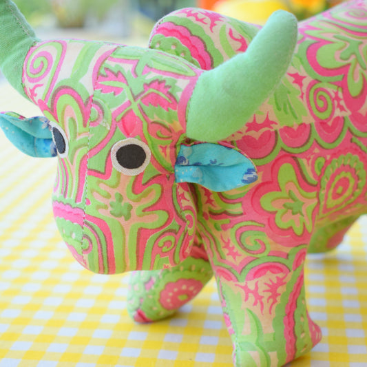 Vintage 1970s Cotton Toy Bull- Pink & Green
