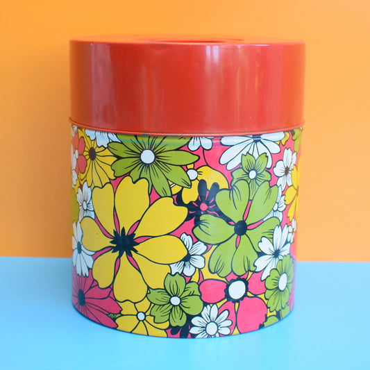 Vintage 1970s Large Metal Tin - Flower Design - Red