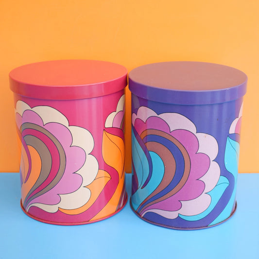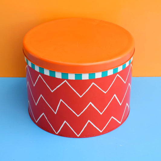 Vintage 1970s Round Metal Tin - Swirl Design- Orange & Pink