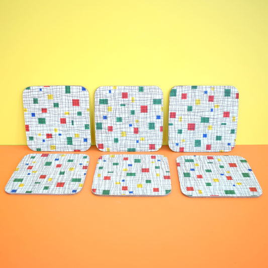 Vintage 1950s Cork Backed Place Mats x6 / Pan Stands - Yellow, Red, Black