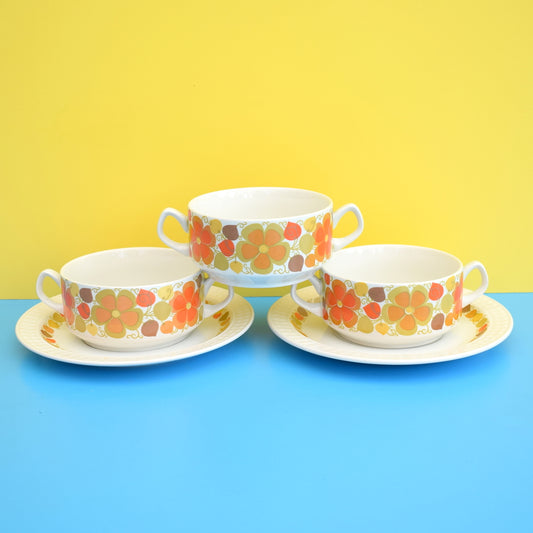 Vintage 1960s Pontesa Fantasia Ceramic Soup Bowls / Plates - Spanish - Flower Power - Orange