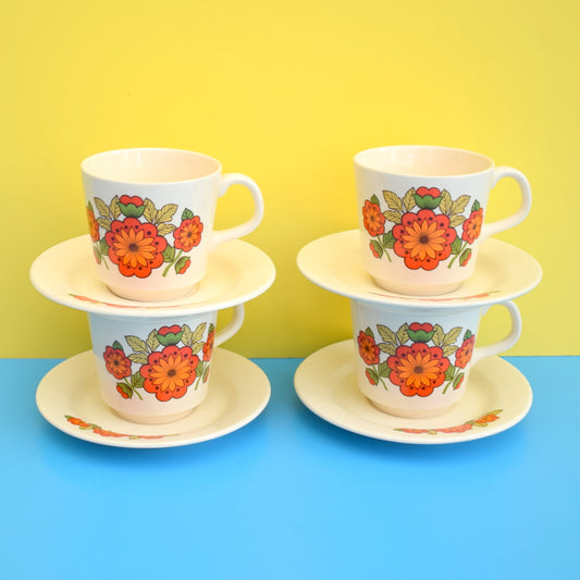 Vintage 1960s Flower Power - Romanian China Cup & Saucers - Orange x4