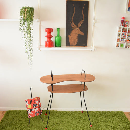 Vintage 1950s Atomic Hall Table - Teak Plywood / Metal - Red Ball Feet