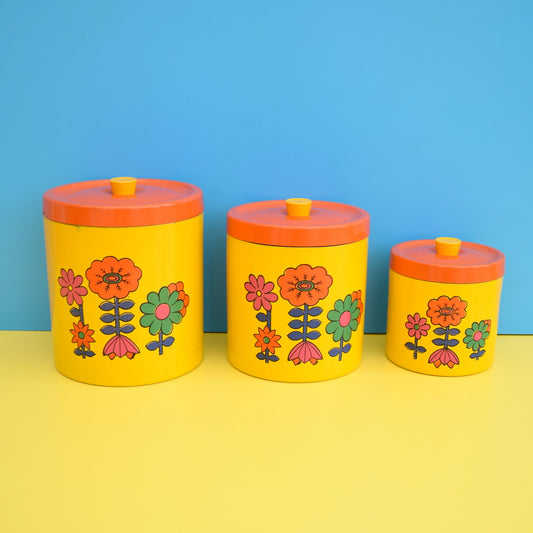 Vintage 1960s Flower Power Lacquered Storage Tins x3 - Yellow