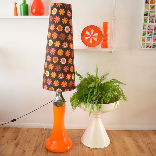 Vintage 1960s Floor Lamp - Glass / Chrome Base - Flower Power Orange & Brown Shade