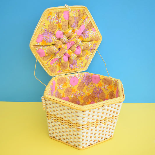 Vintage 1960s Sewing / Hobby Box - Yellow & White Woven With Flower Power