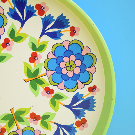 Vintage 1960s Round Tray - Flower Power Design - Green / Blue