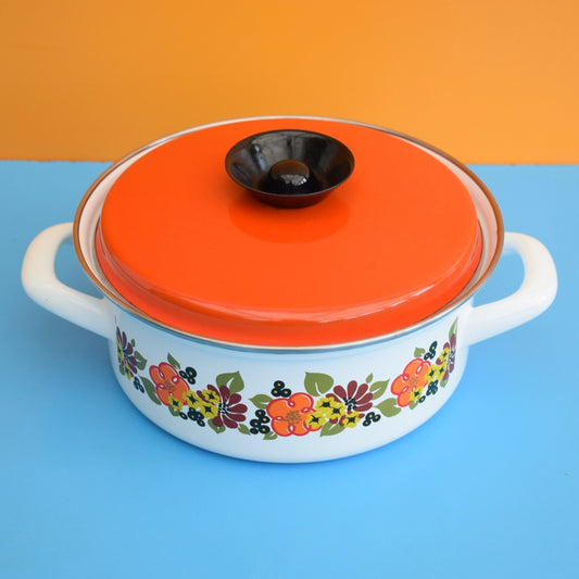 Vintage 1960s Enamel Casserole - Orange & Green Flower Power