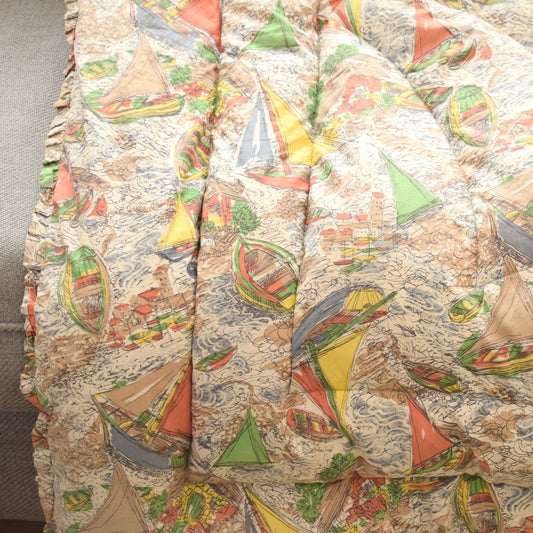 Vintage 1950s Kitsch Sailing Ship Print Eiderdown - Pastel Colours