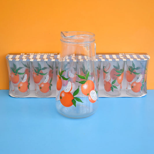 Vintage 1960s Fruit Design Drinking Glasses & Jug Set - Boxed. Orange