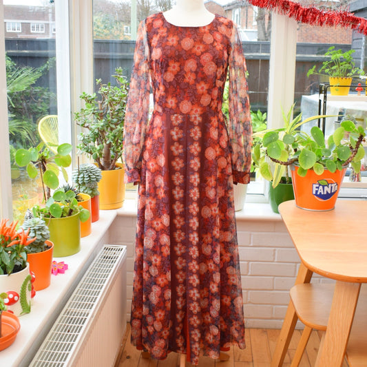 Vintage 1970s Maxi Floaty Dress - Brown/ Orange - Sz 12