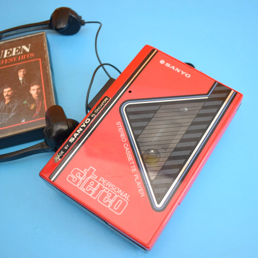 Vintage 1980s Personal Cassette Player, Headphones & Queen Tape - Sanyo / Toshiba