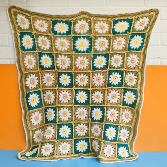 Vintage 1970s Crochet Small Blanket - Flower Design