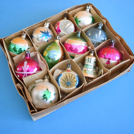 Vintage 1960s Glass Christmas Baubles - 12 Medium . Pink, Blue & Green