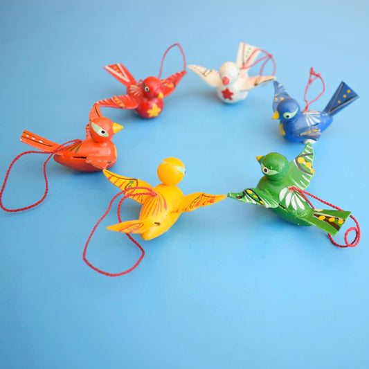Vintage 1970s Wooden Hand Painted Birds - Rainbow Colours x6