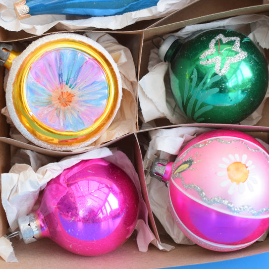 Vintage 1950s Hand Painted Medium / Concave Glass Christmas Baubles / Decorations - Pink, Green, Yellow, Blue - Boxed