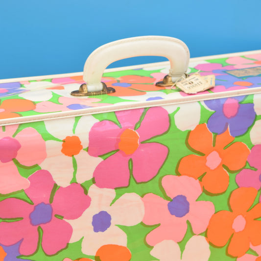 Vintage 1960s PVC Large Suitcase, Flower Power - Pink, Orange, Green, Purple