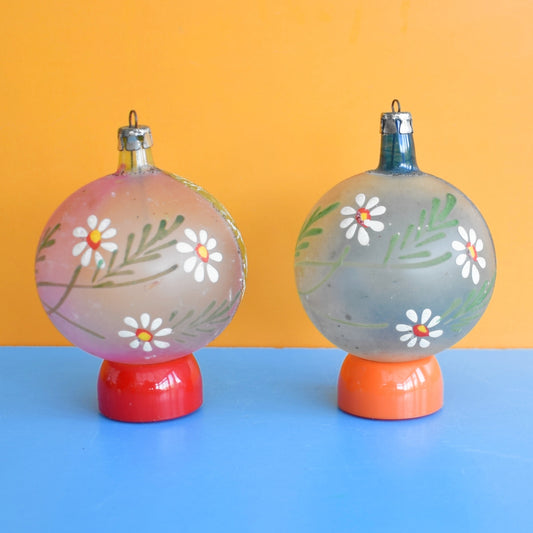 Vintage 1950s Glass Christmas Baubles - Hand Painted Daisies x2