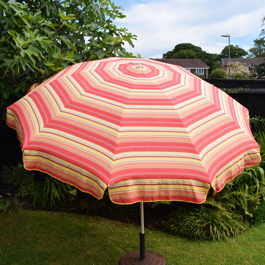 Vintage 1980s Large Garden Parasol - Striped - Coral / Yellow