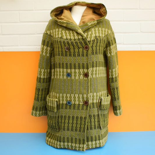 Vintage 1960s Welsh Tapestry Hooded Coat - Green / Black Sz 12 ish