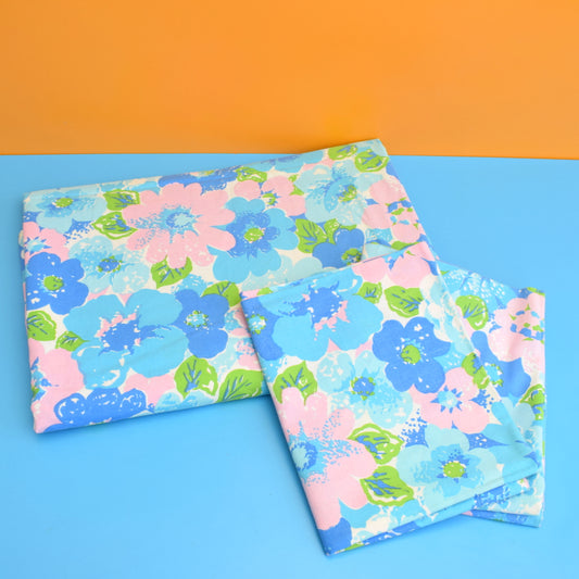 Vintage 1960s Twin Sheet & Pillowcases - Flower Power - Blue