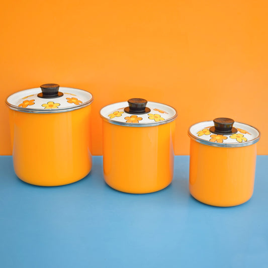 Vintage 1960s Flower Power Enamelled Storage Tins x3 - Yellow & Orange