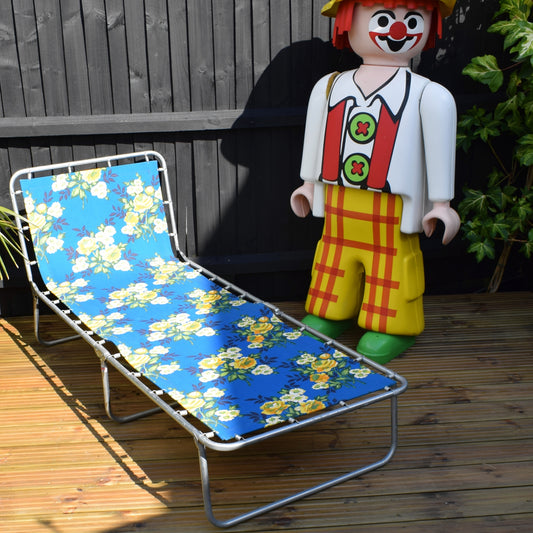 Vintage 1970s Garden Sun Lounger - Blue & Yellow Flowers