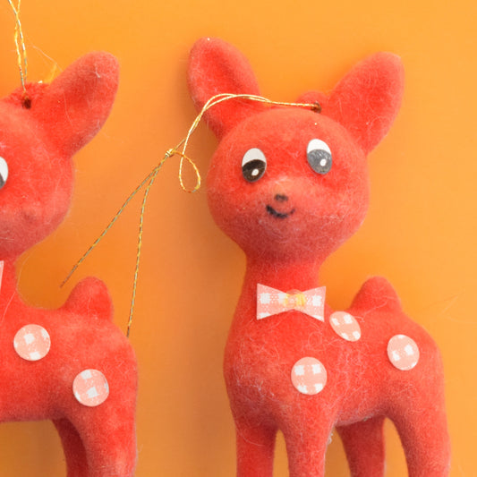 Vintage 1960s Flocked Kitsch Bambi Christmas Decoration Pair - Red