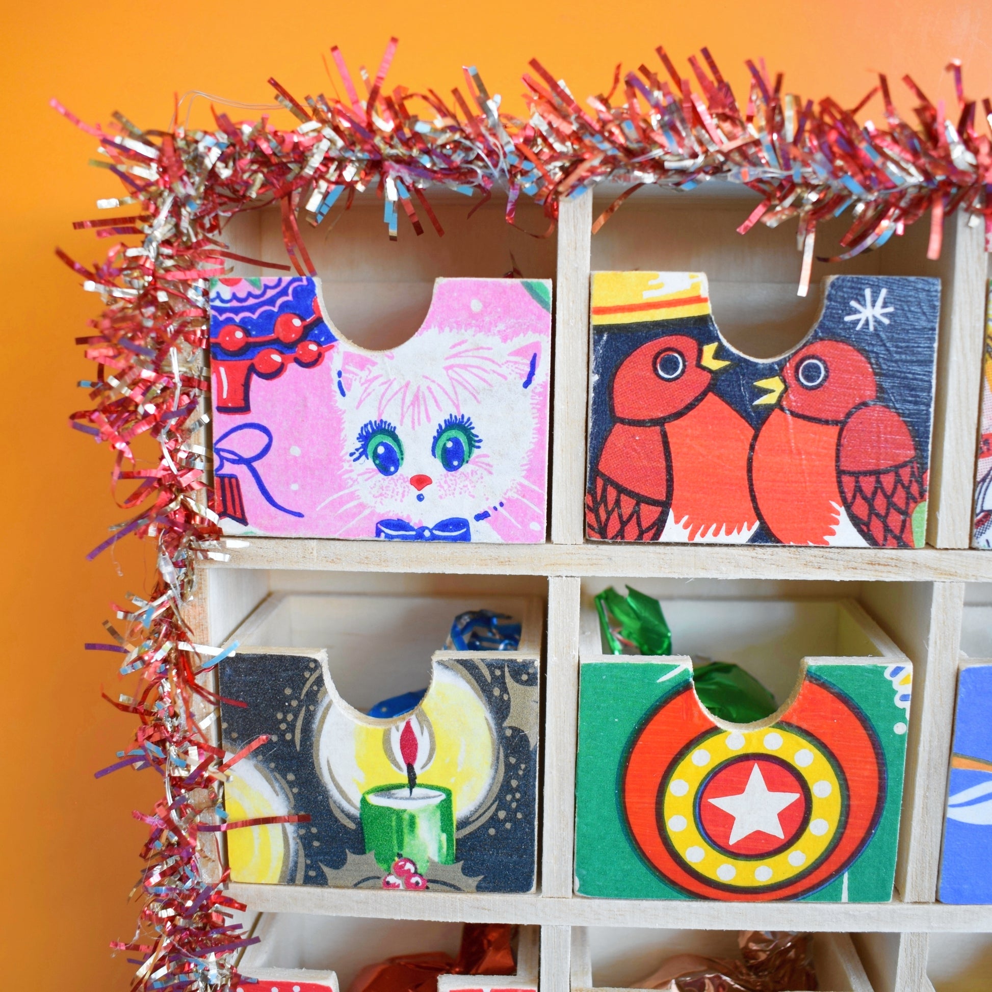 A handcrafted wooden multi-drawer Advent calendar decorated with vintage wrapping papers and filled with tiny treasures, perfect for lovers of nostalgic, collectible Christmas décor and a unique way to count down the days.