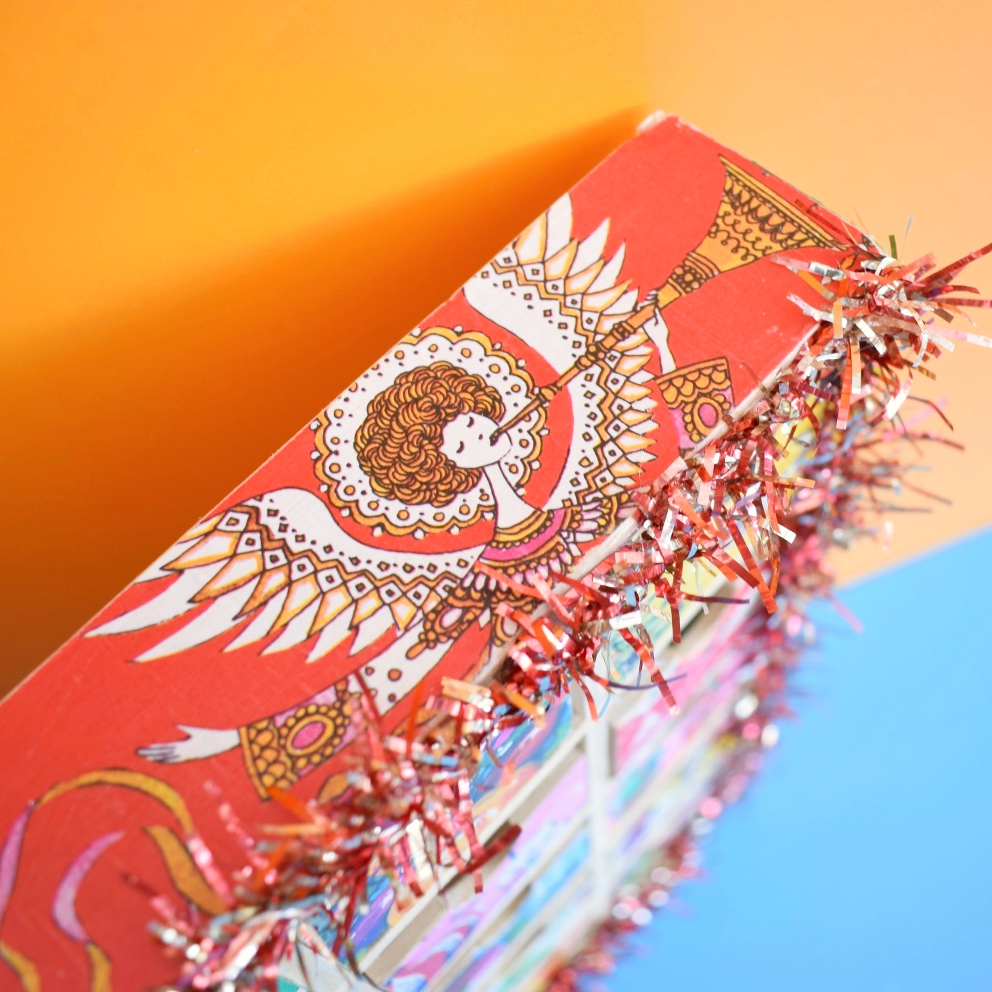 - Design Handmade patchwork Advent calendar with fronts and sides covered in vintage Christmas papers; includes battery‑operated lights; created using repurposed vintage materials.
