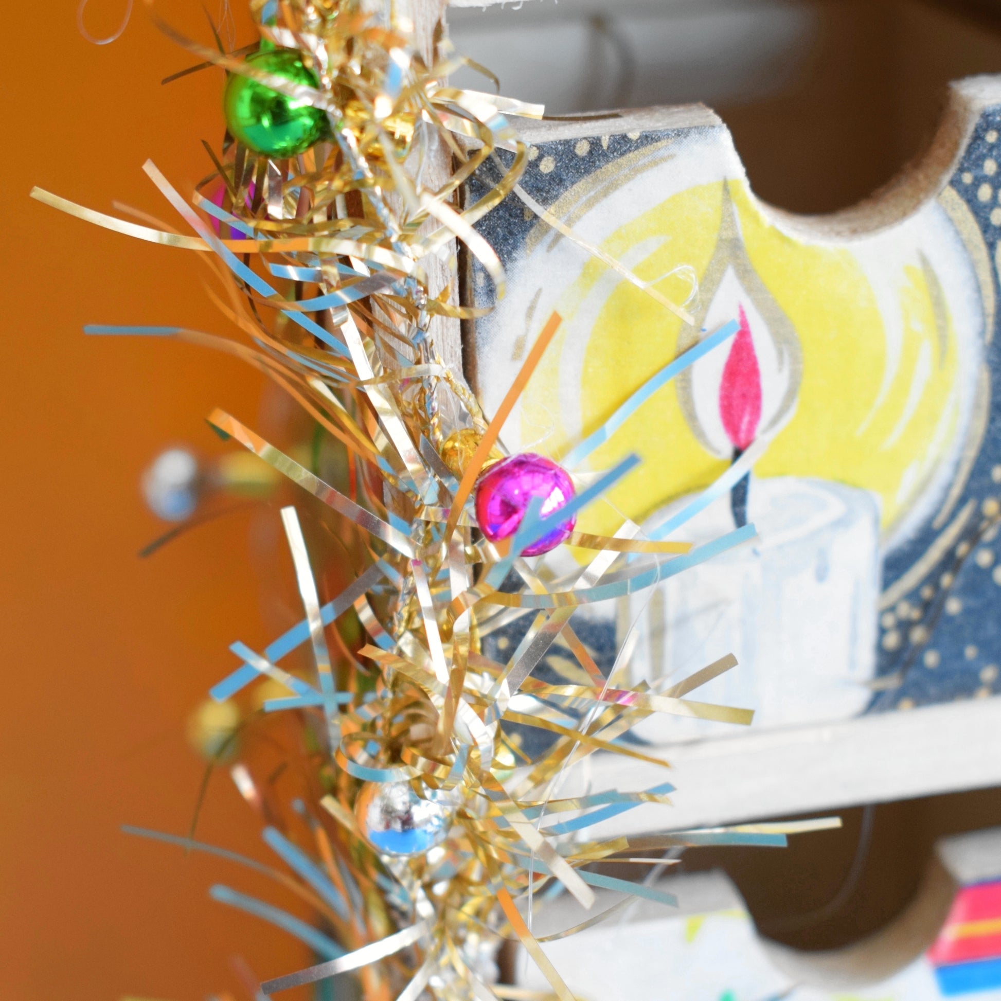 - Design Handmade patchwork Advent calendar with fronts and sides covered in vintage Christmas papers; includes battery-operated lights; created using repurposed vintage materials.