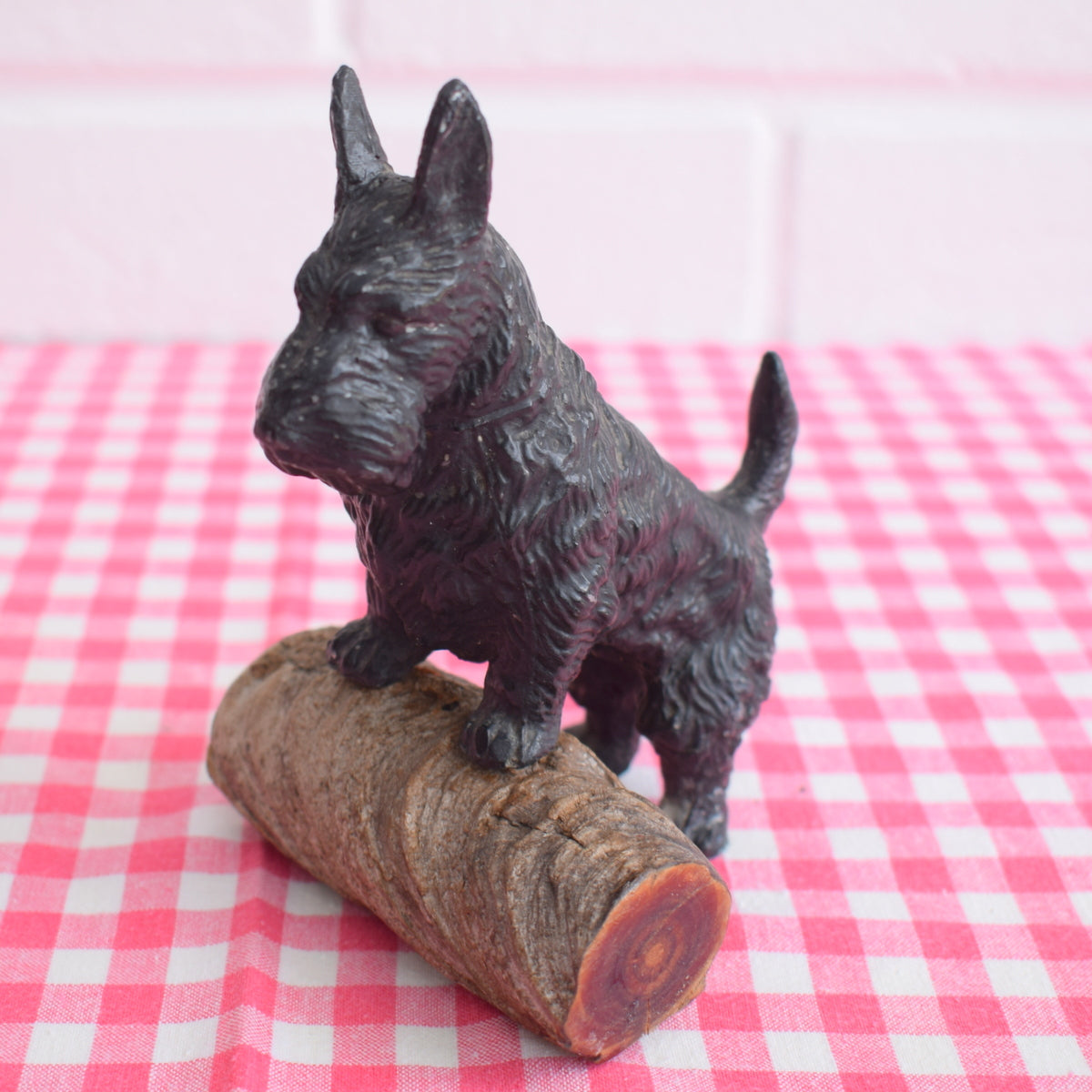 This is a very cute metal scotty dog, resting on a real log