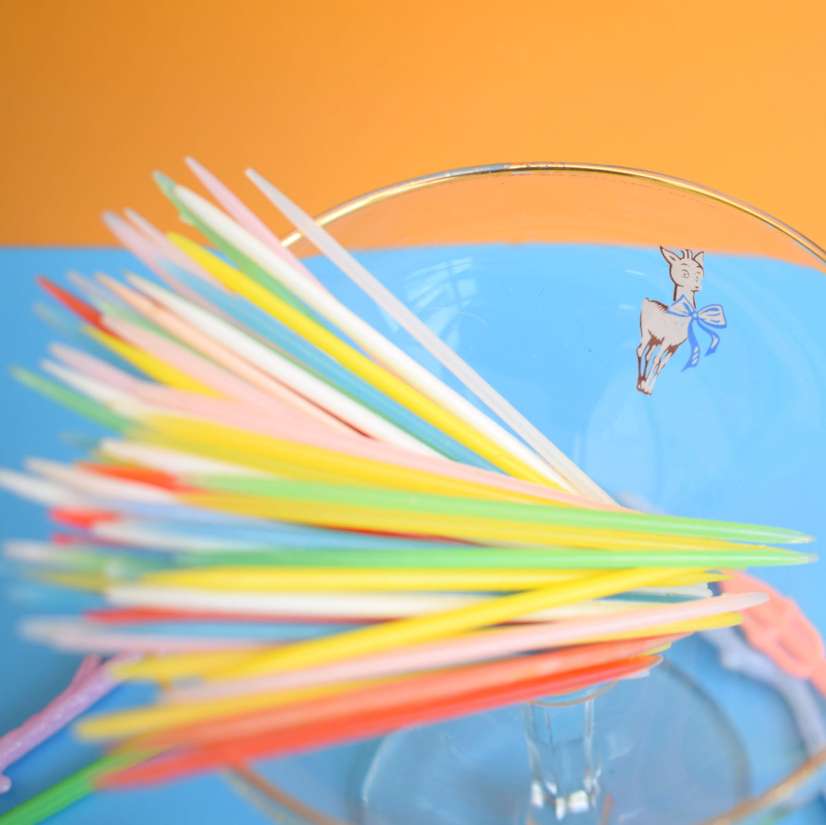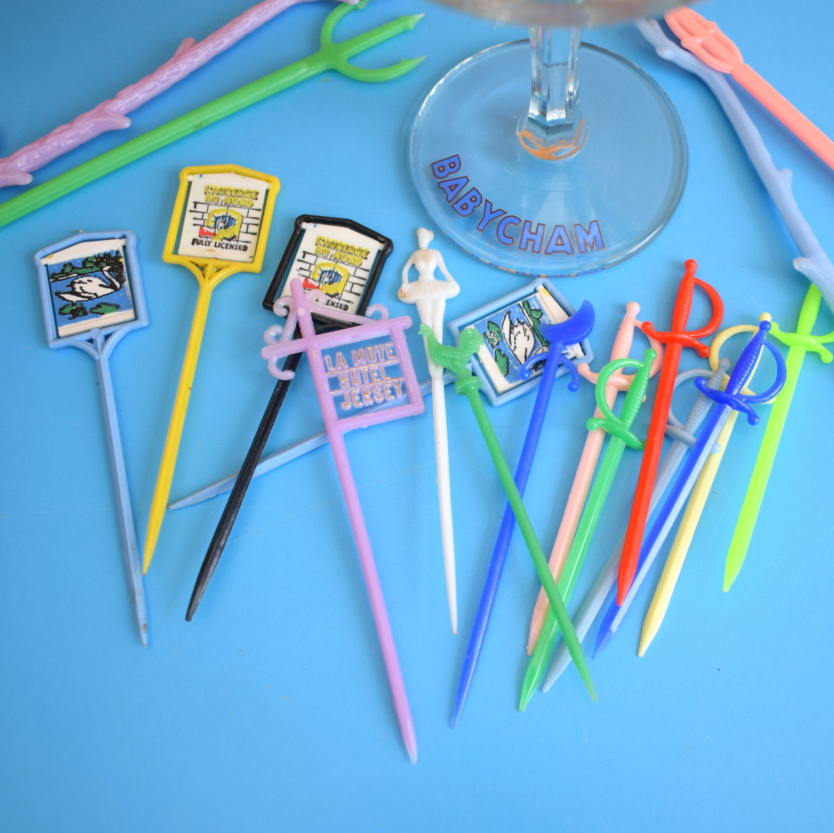 This is a single vintage Babycham glass with a pile of period (plastic) cocktail stirrers / sticks
