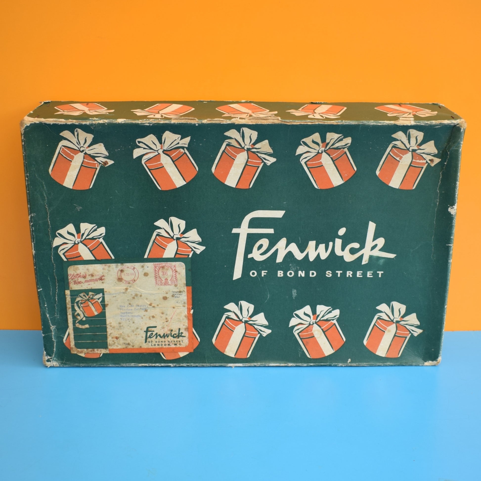A charming mid-century Fenwick of Bond Street cardboard gift box from the 1950s — ideal for collectors, vintage shop displays, and anyone seeking authentic retail nostalgia with a worn, characterful patina.