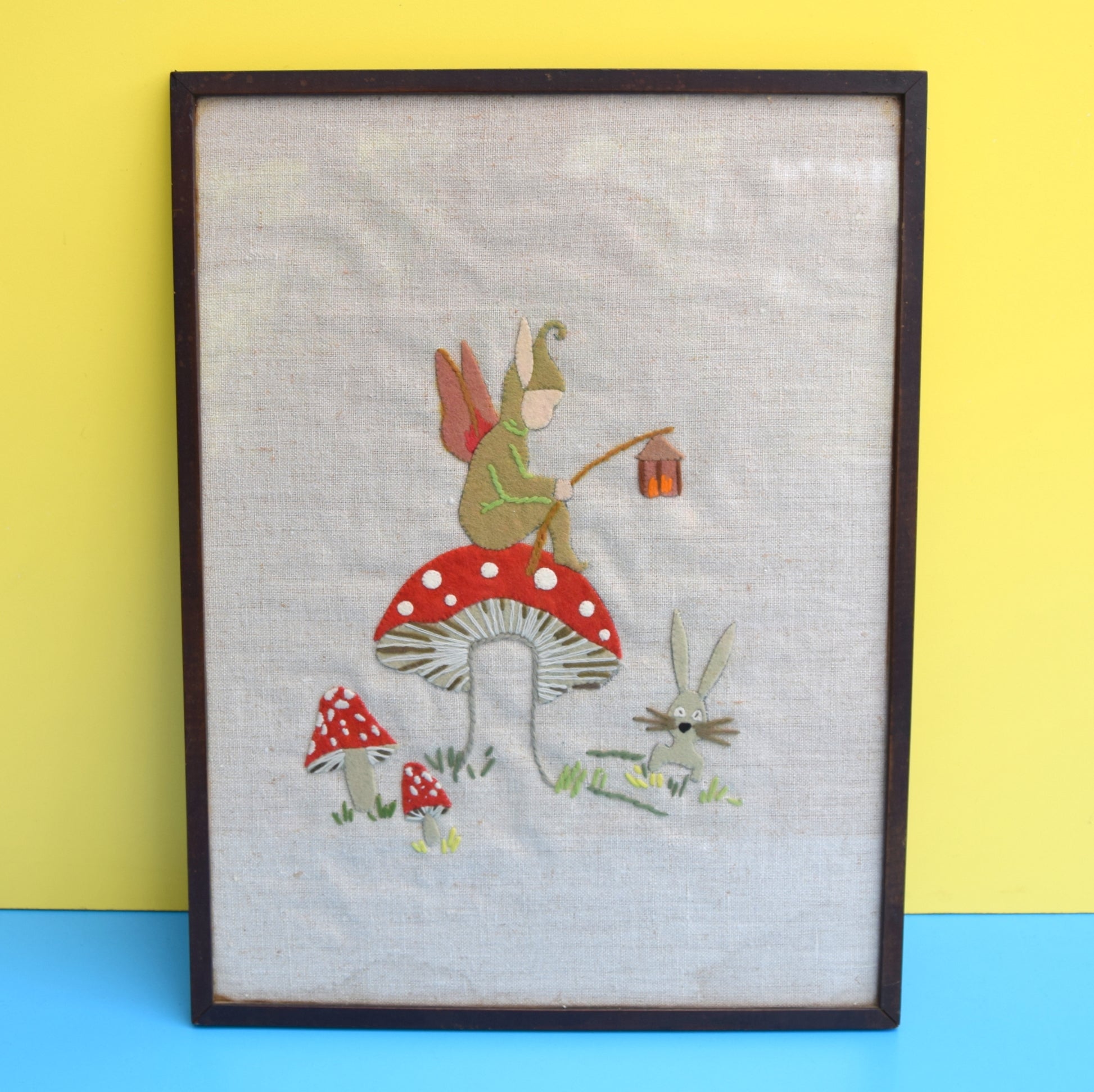 Vintage 1950s Embroidered Felt Picture - Toadstool & Pixie