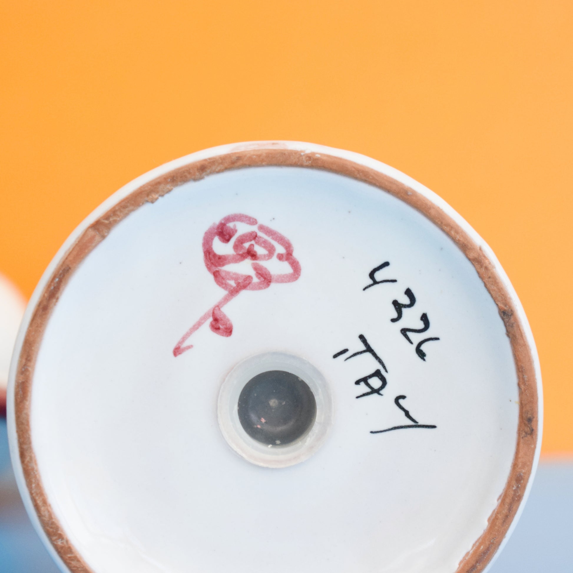 These distinctive pieces showcase classic Bitossi craftsmanship — hand-formed silhouettes, a glossy glaze and cheerful painted accents that make them an eye-catching addition to any vintage-themed collection. The original stoppers remain fitted underneath, preserving usability while enhancing authenticity. Display them on open shelving, a kitchen windowsill, or as a focal point in a curated ceramics grouping.