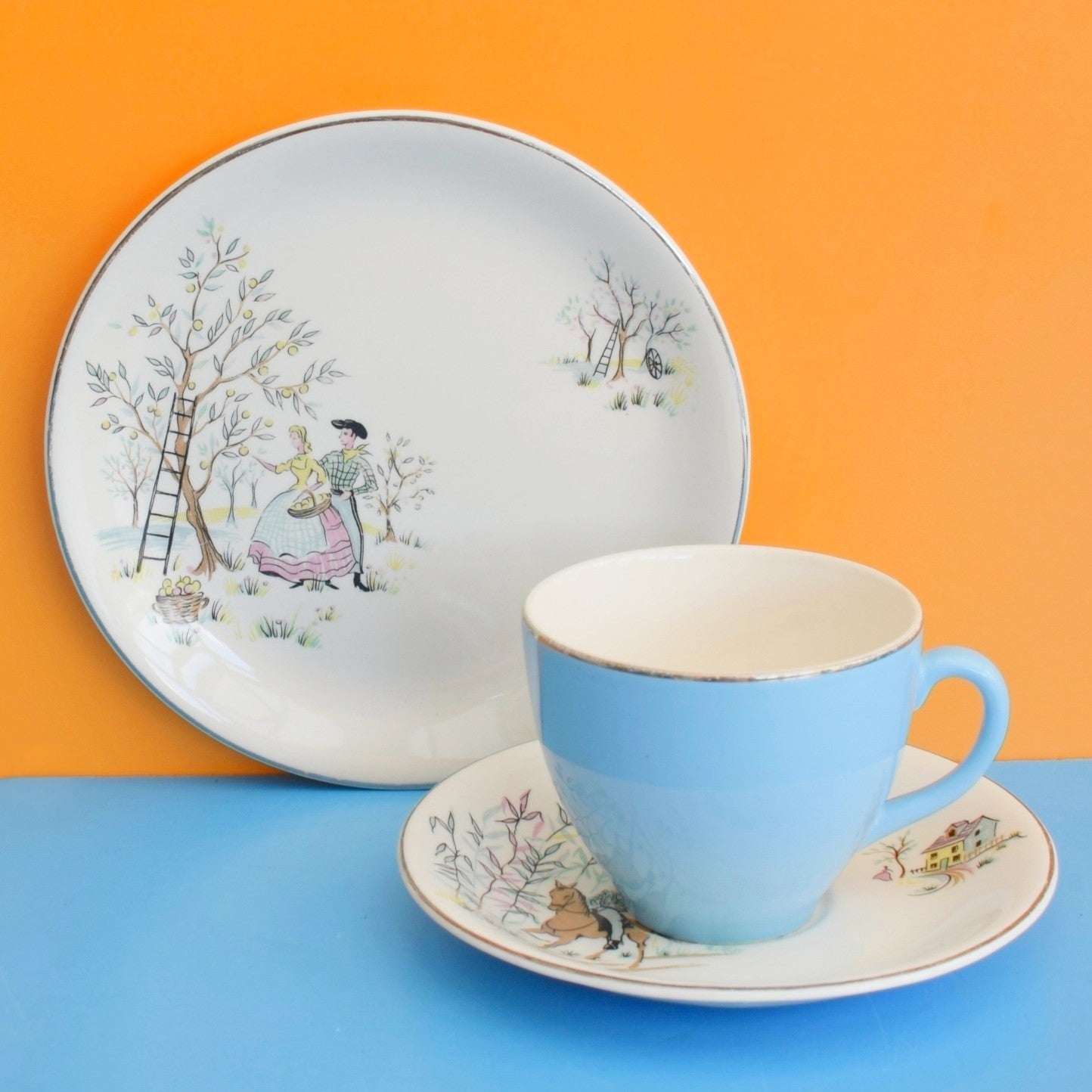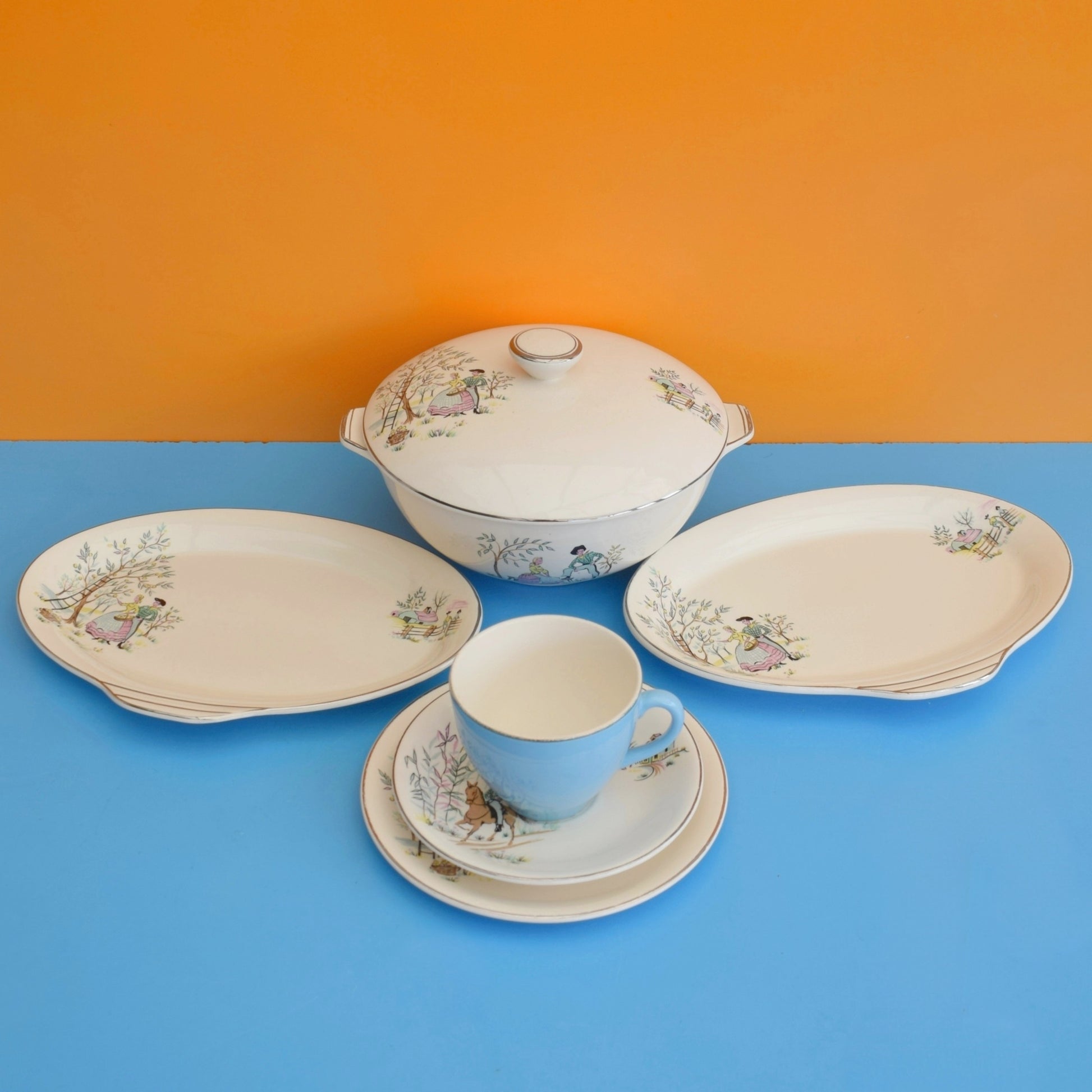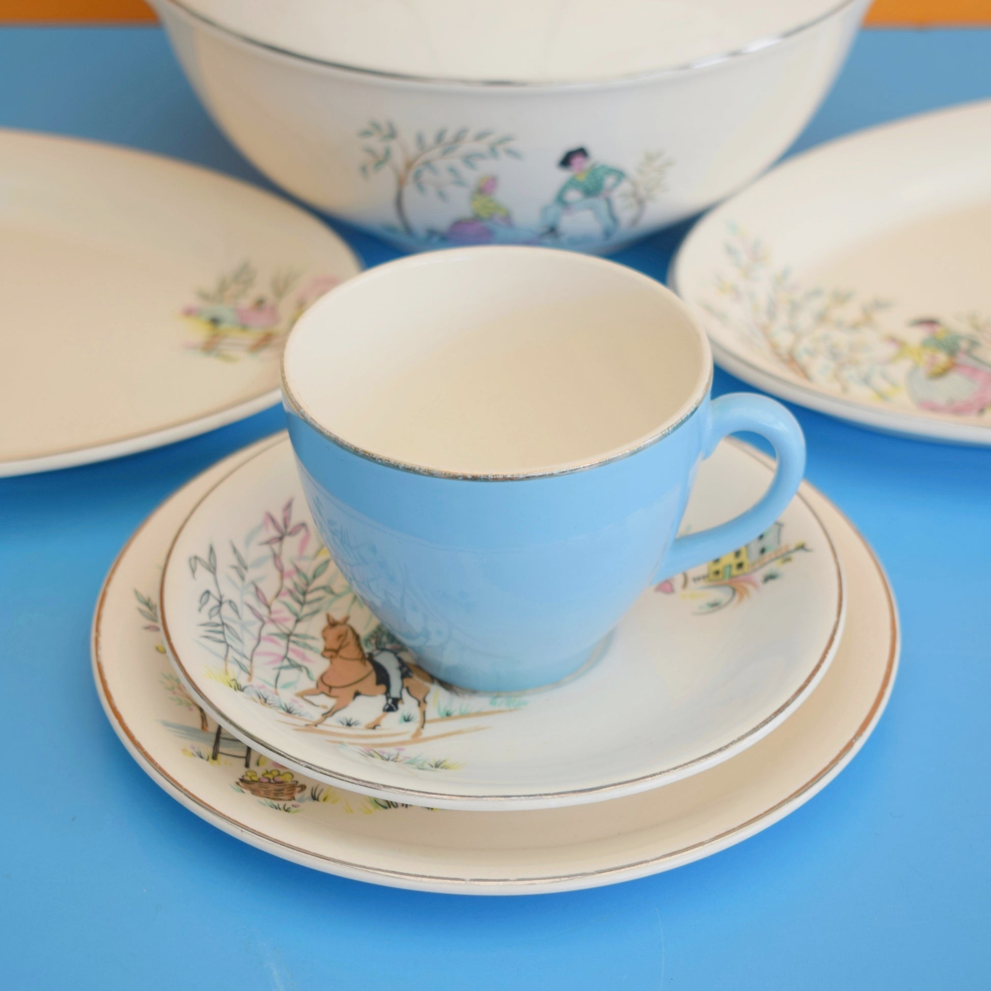 The blue cup is not original to the set, but co-ordinates nicely, and is of the same period