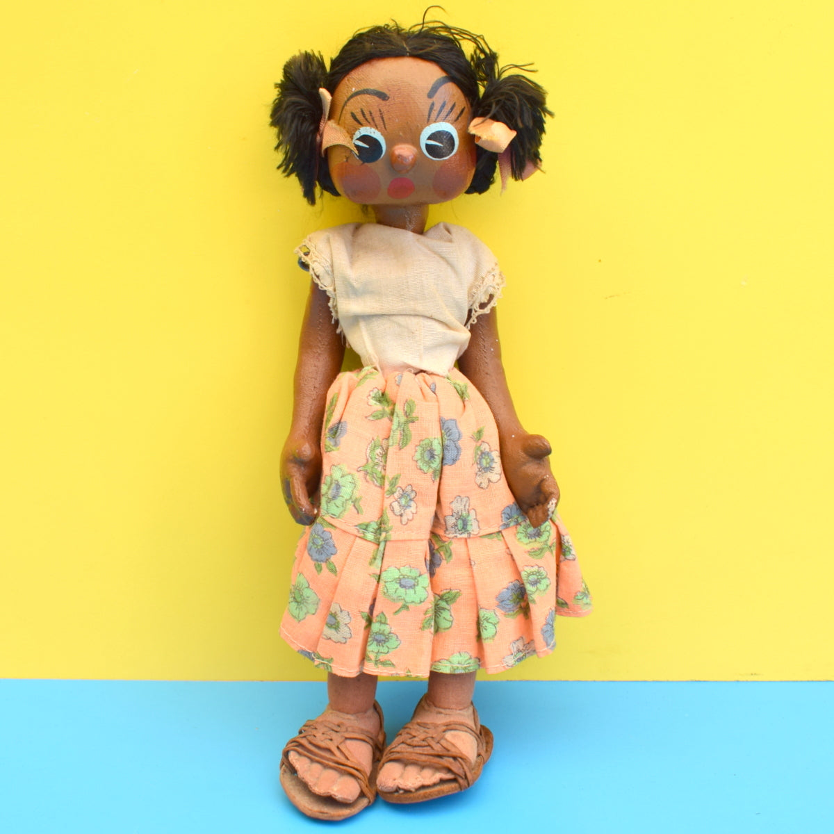 Vintage 1950s Lovely Painted Canvas Dolly - Peach Flower Skirt, Hinged Arms & Legs