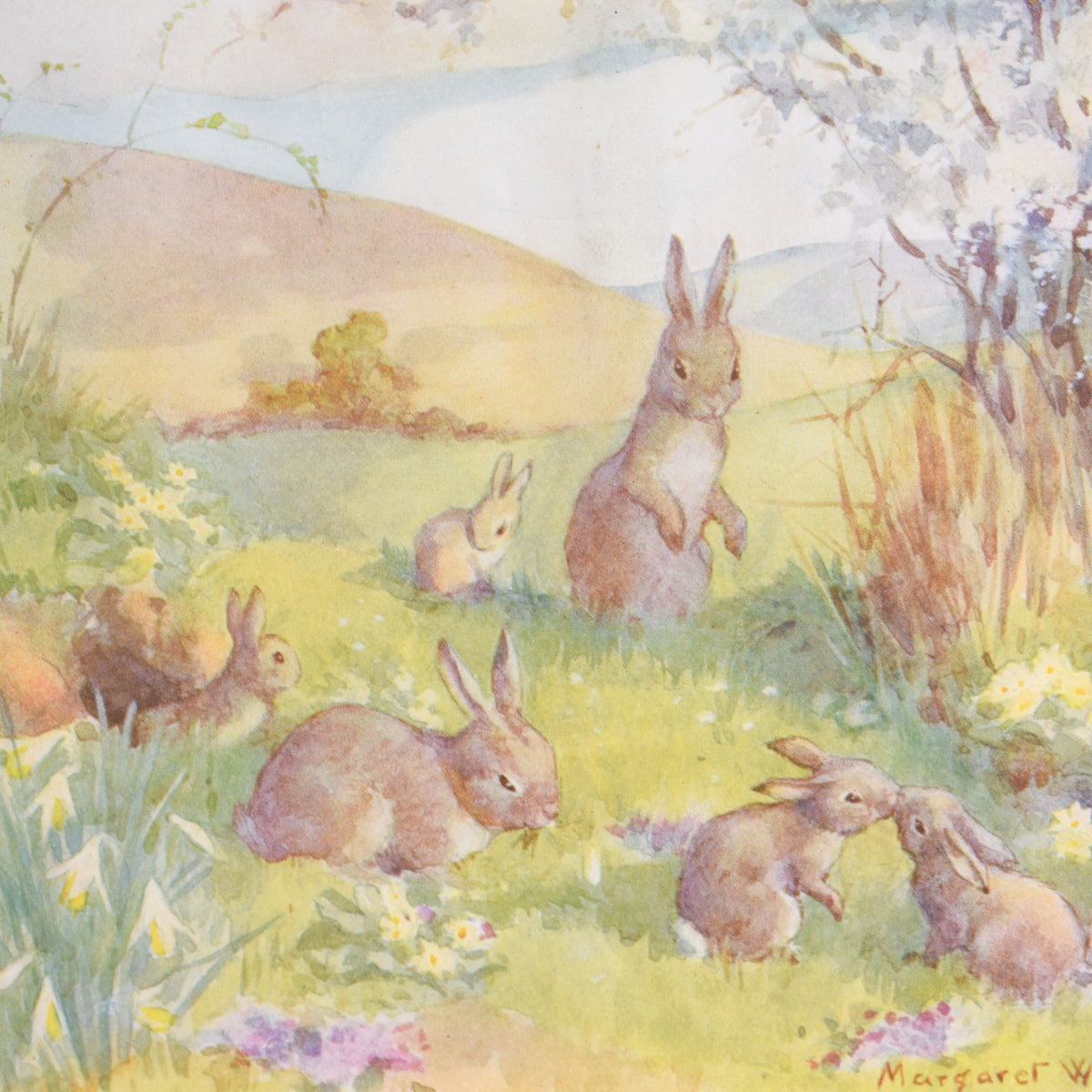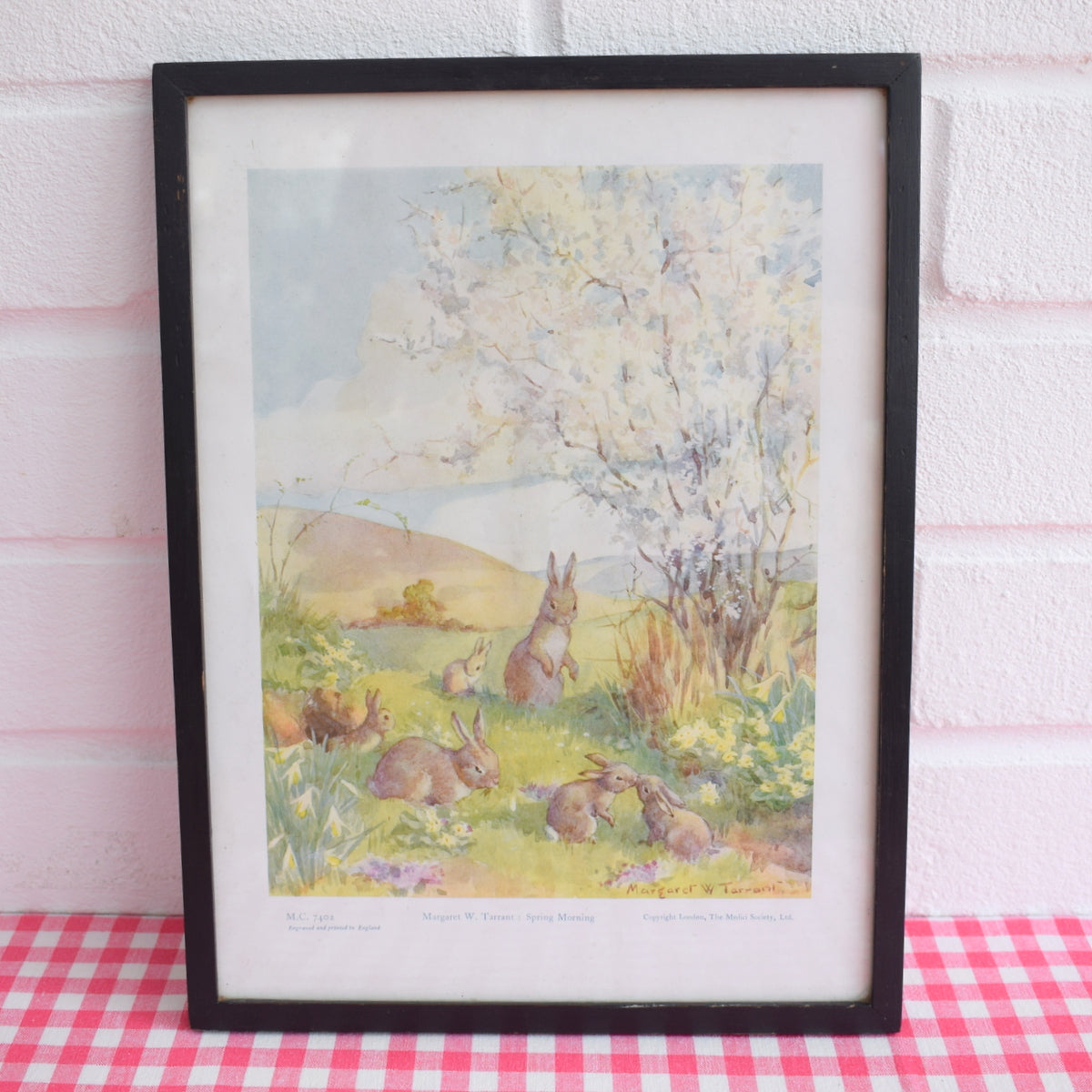 This is a lovely framed print by Margaret Tarrant, called Spring Morning With lots of bunnies and spring flowers