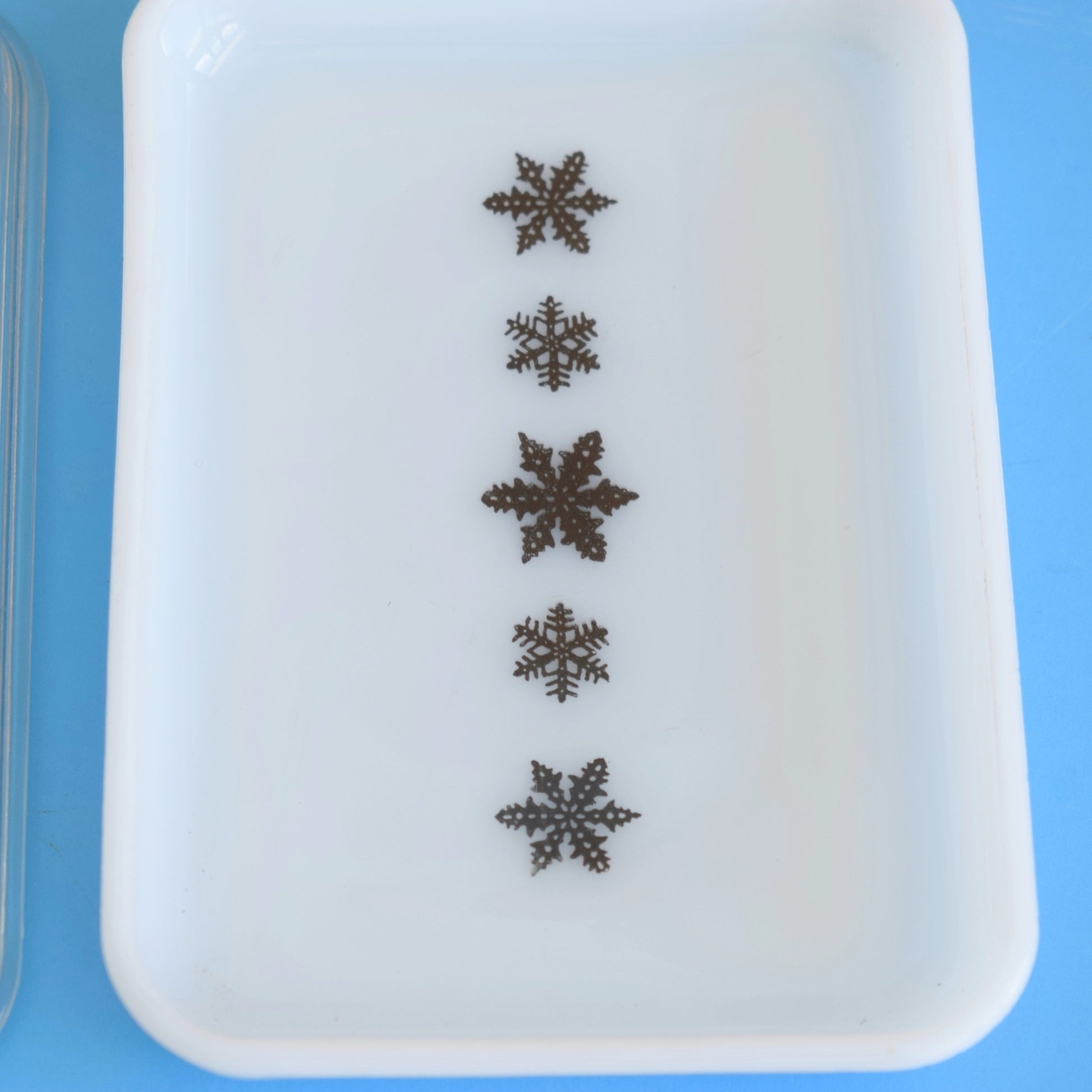 - Design Pyrex manufacturer — Snowflake pattern in monochrome; classic mid-century covered butter-dish profile