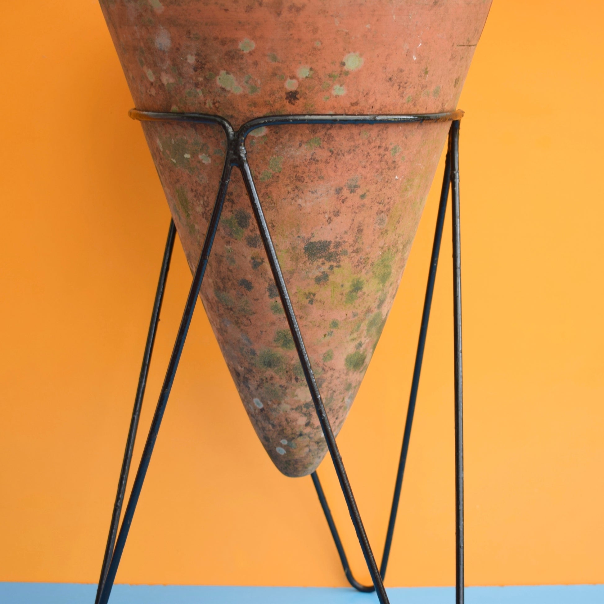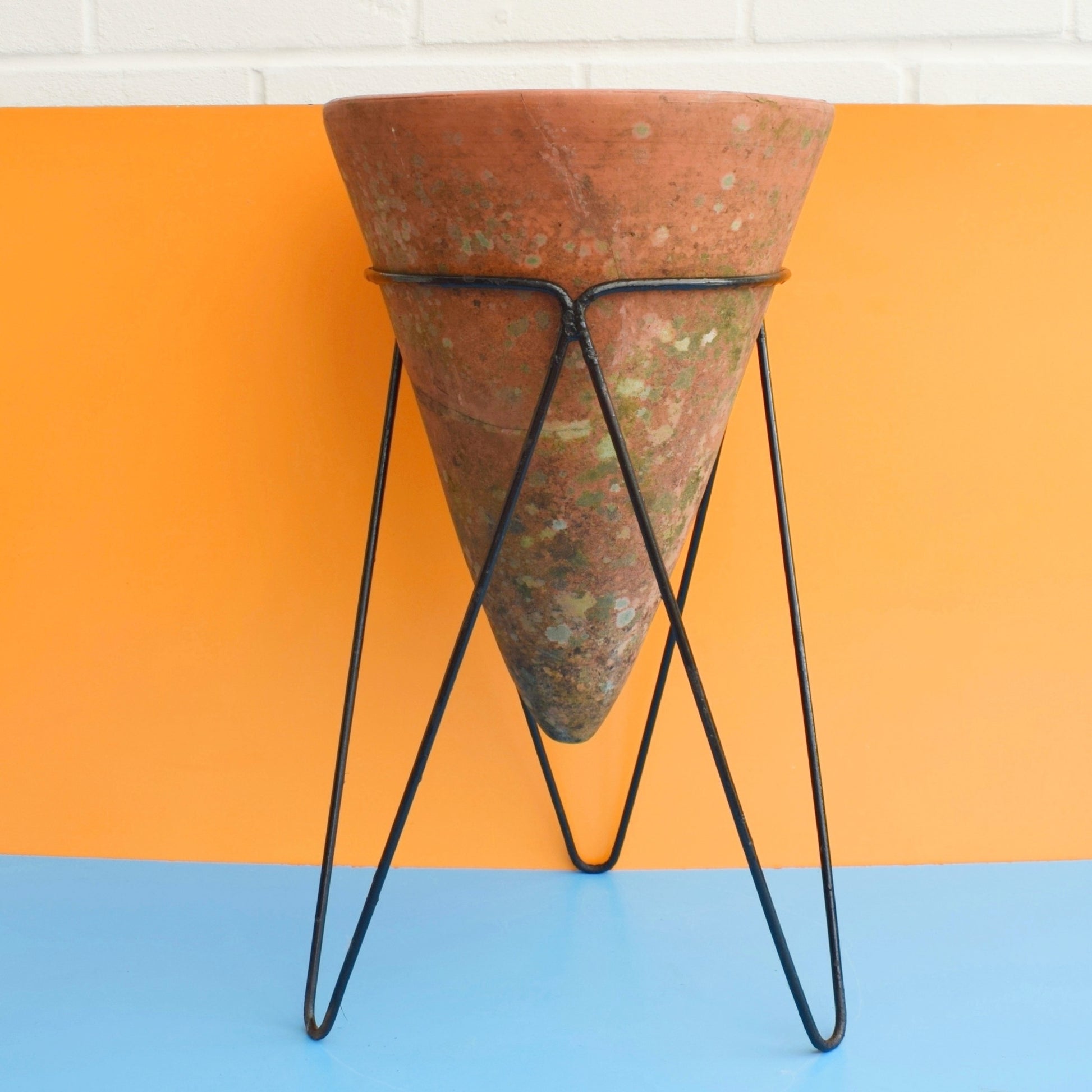 A rare vintage 1950s conical terracotta planter on a black metal hairpin stand — ideal for midcentury modern lovers, collectors, and anyone seeking a sculptural statement for indoor greenery.