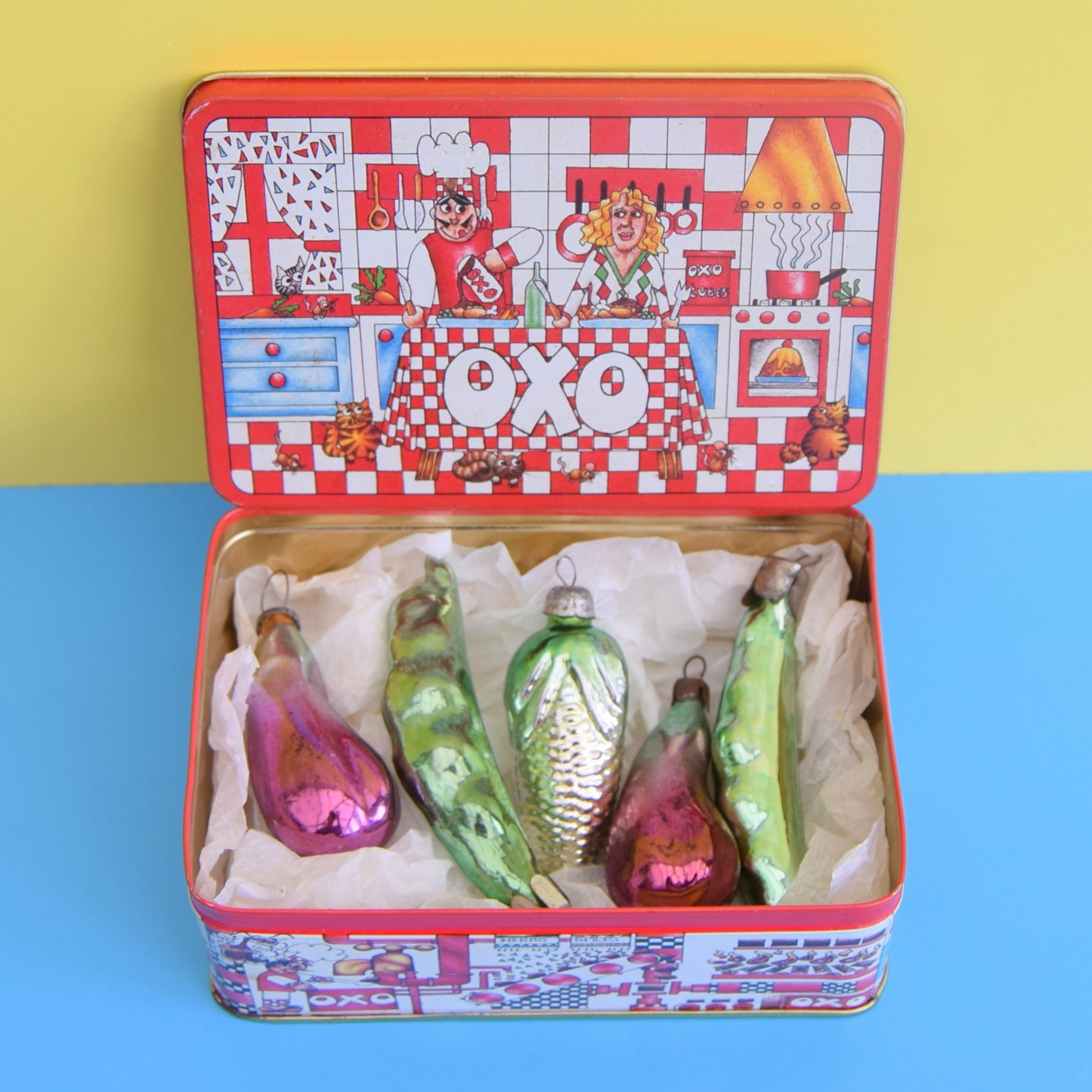 In this vintage Oxo tin there is a small sweetcorn, two pea pods and two aubergines