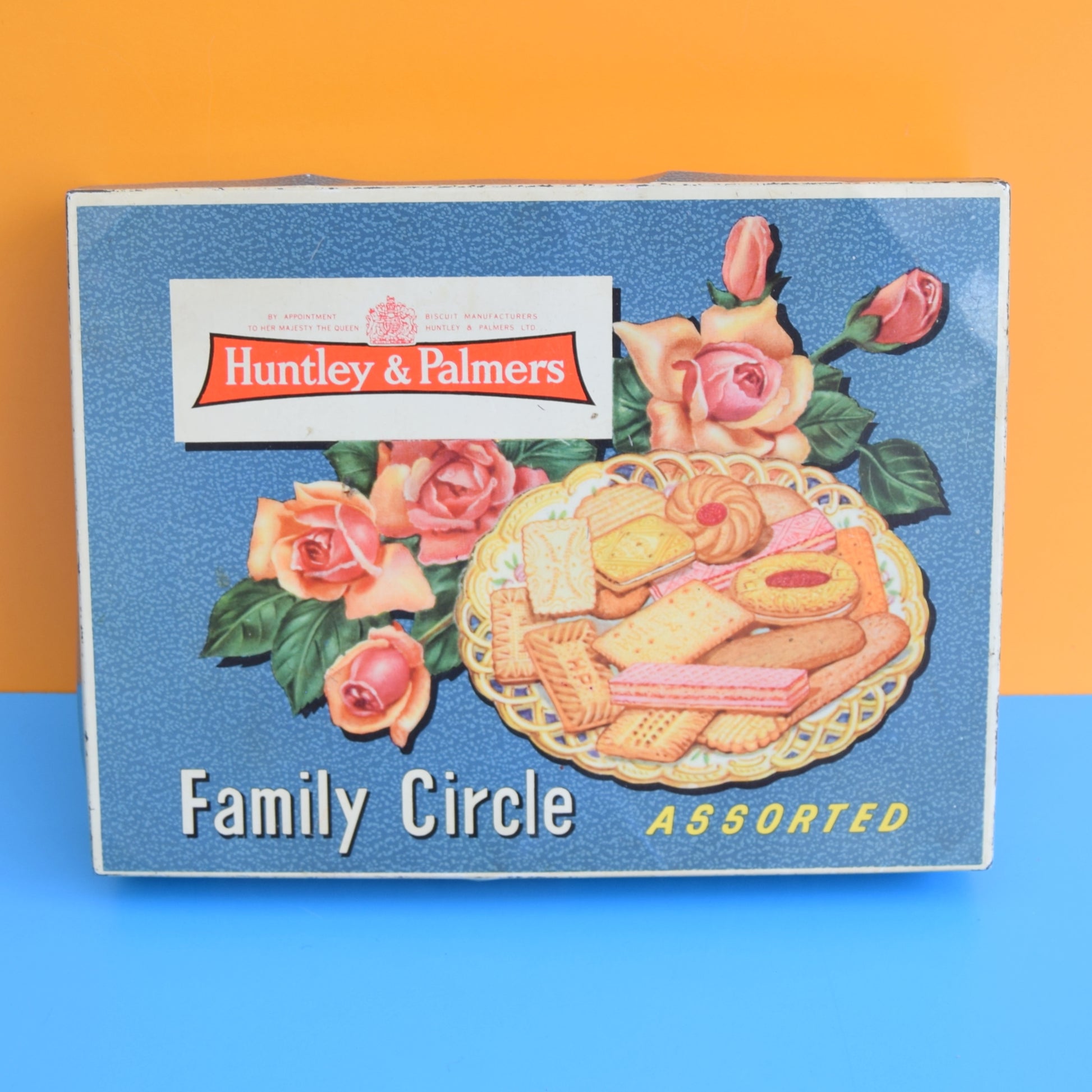 This is a great, kitsch tin from the 1950s (maybe 60s) from Huntley & Palmers, it is the family circle assortment (inc pink wafers and jammy dodgers)!