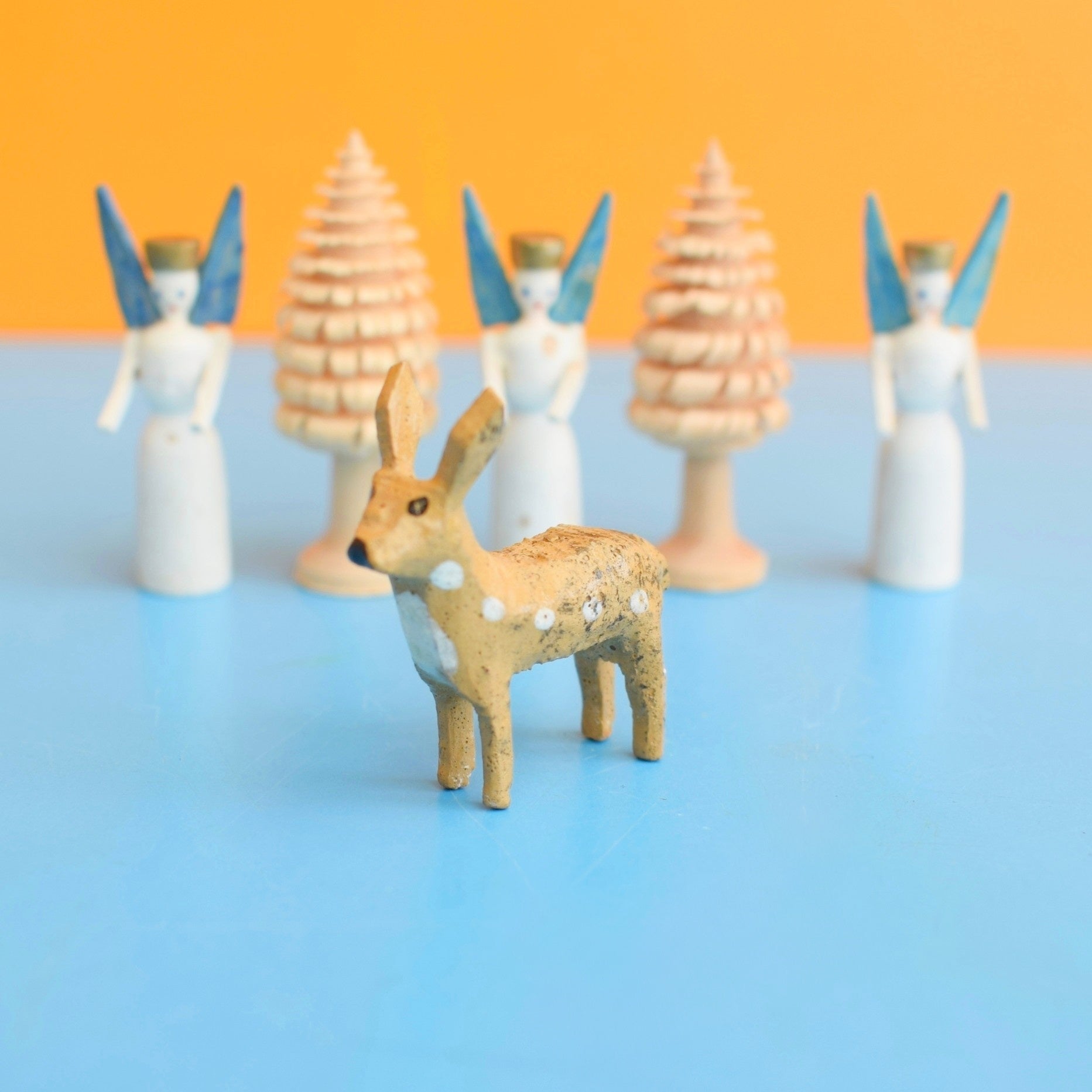 Delightful vintage 1950s Erzgebirge wooden Christmas miniatures — a boxed set of tiny hand-carved trees, angels and a Bambi, perfect for collectors, dollhouse enthusiasts and lovers of traditional German holiday decor.