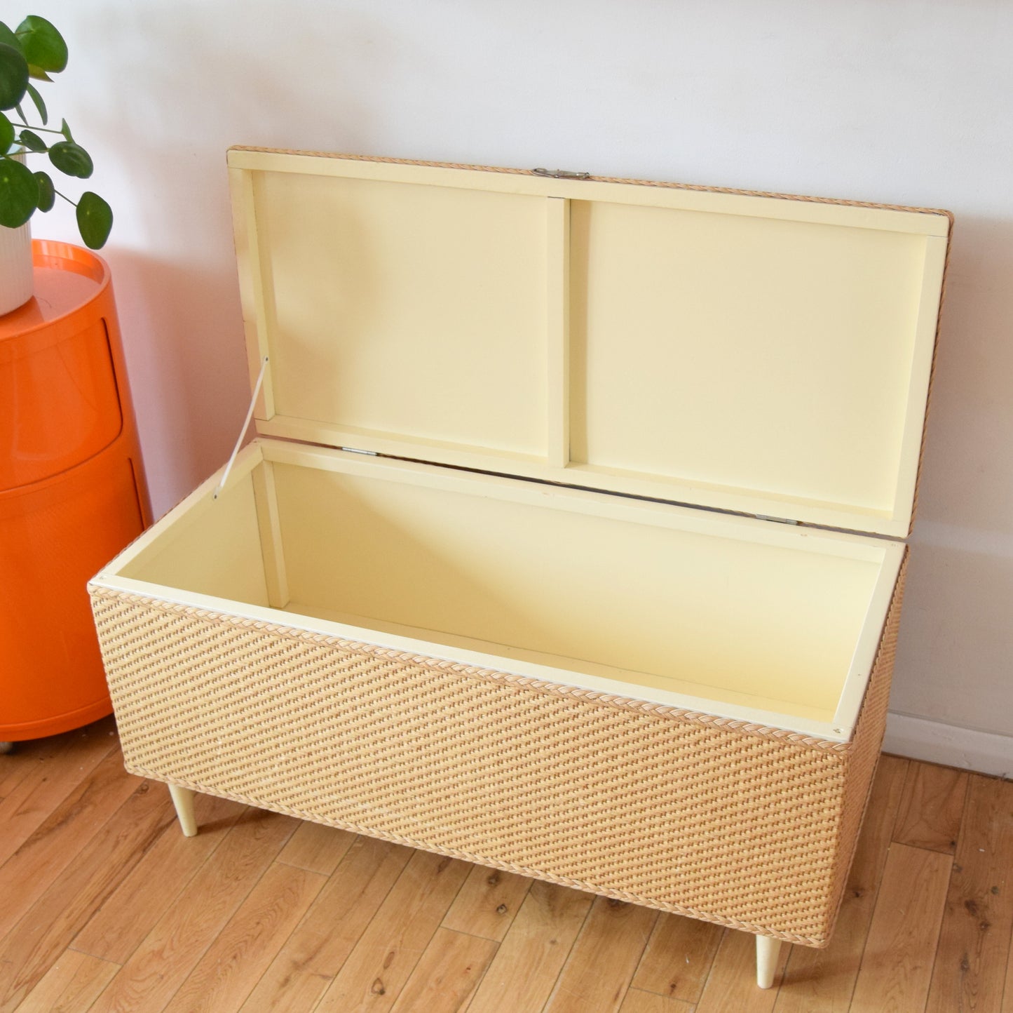 It is an original 1960s piece, with fantastic vinyl covering on the top, and the original natural wicker covering to the sides.