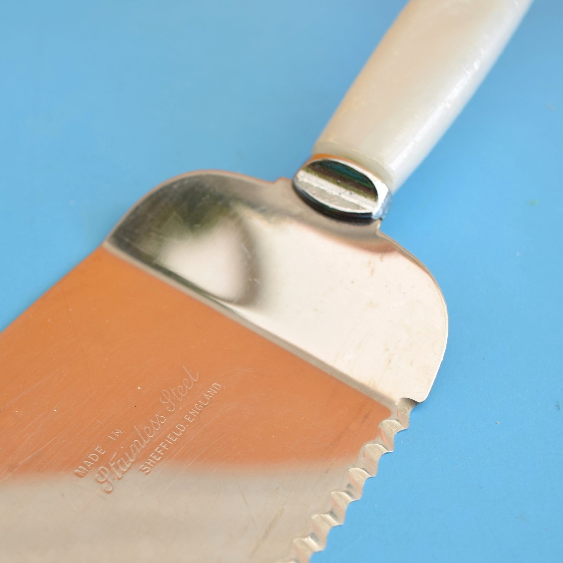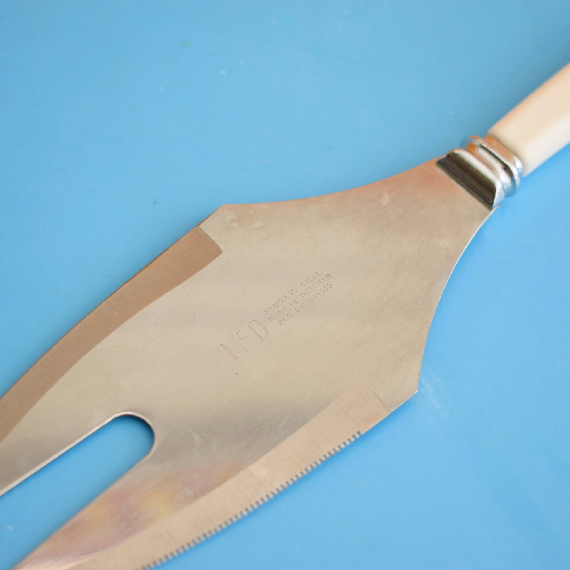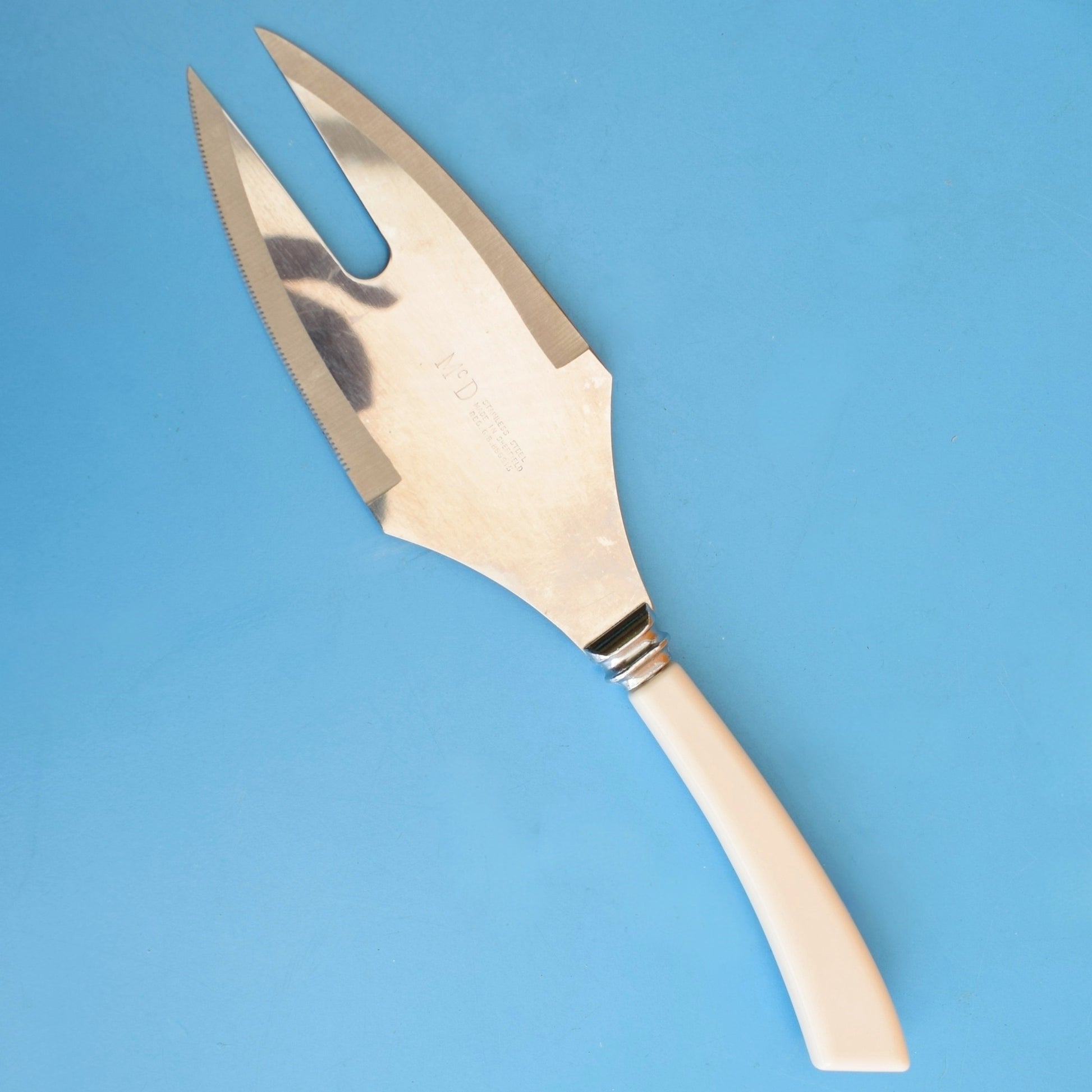 - Design Unbranded mid-century design; streamlined white/cream Lucite handles with a classic metal serving blade and matching fork, typical 1960s domestic tableware