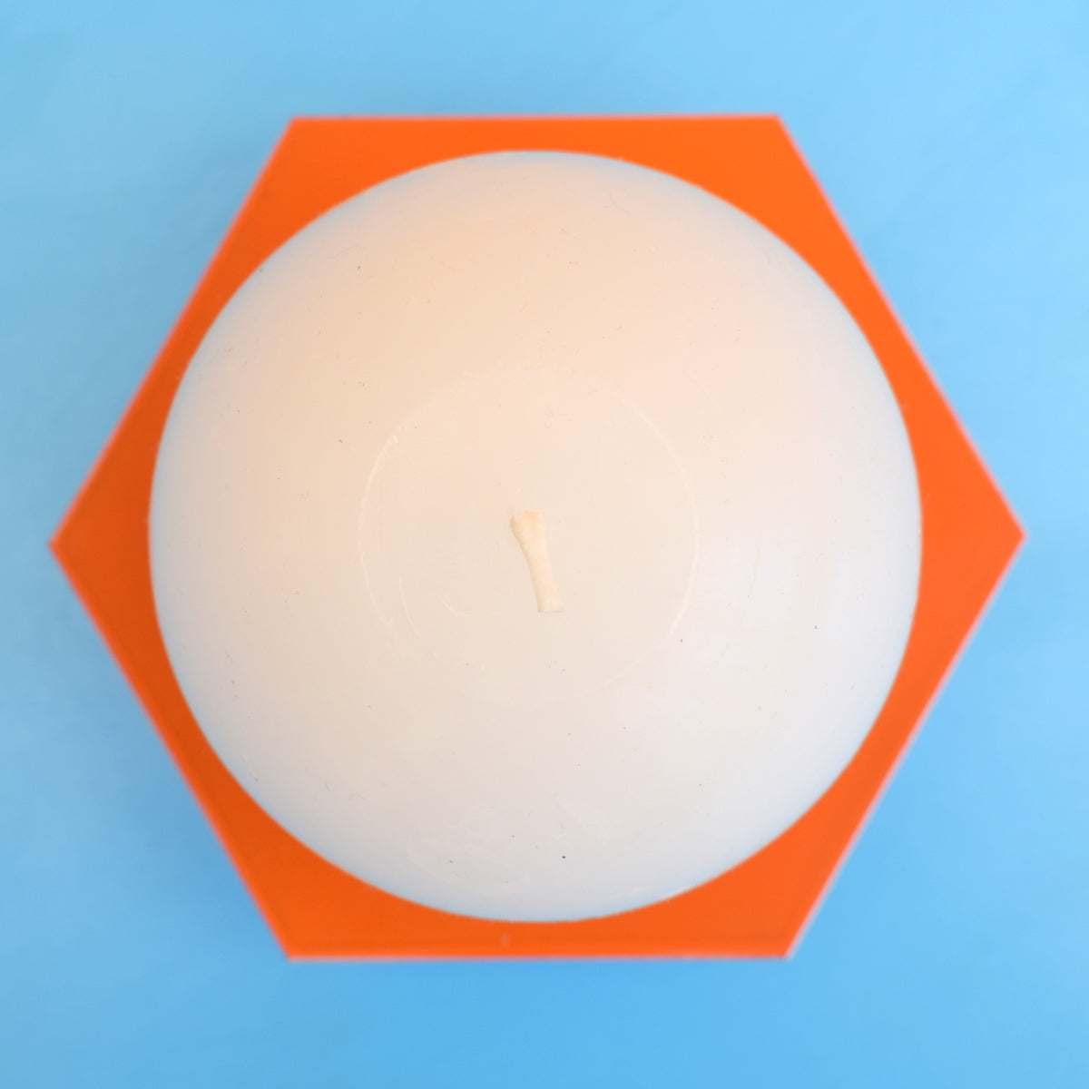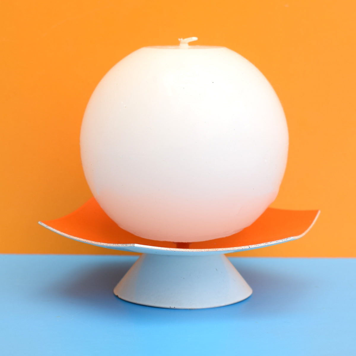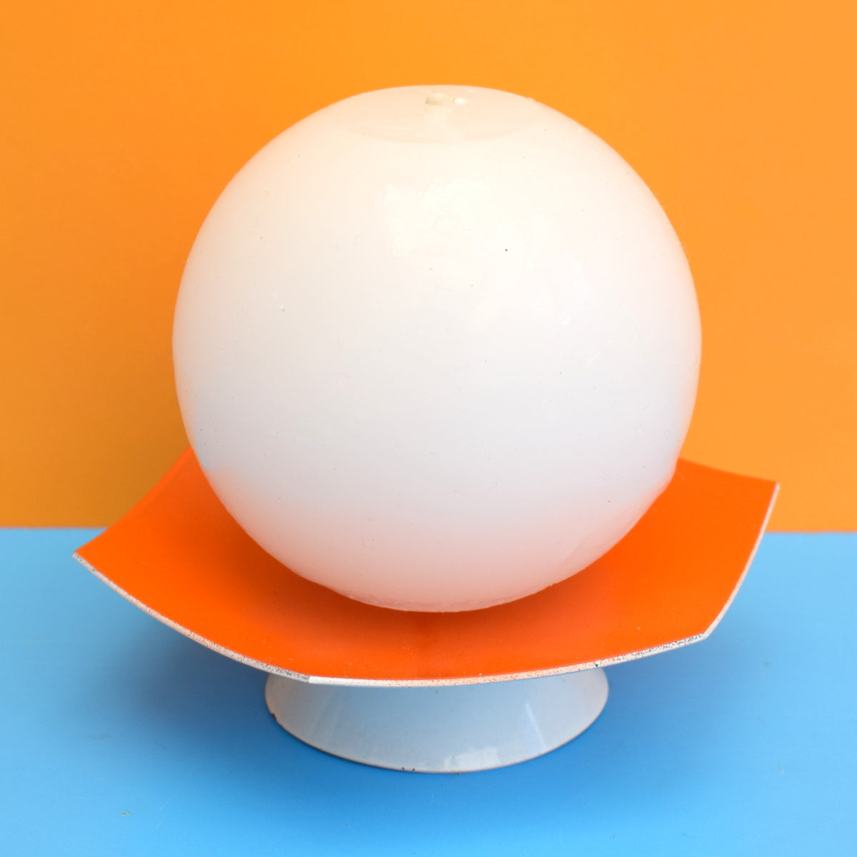 This is an unusual orange and white metal candle holder, with unused ball candle