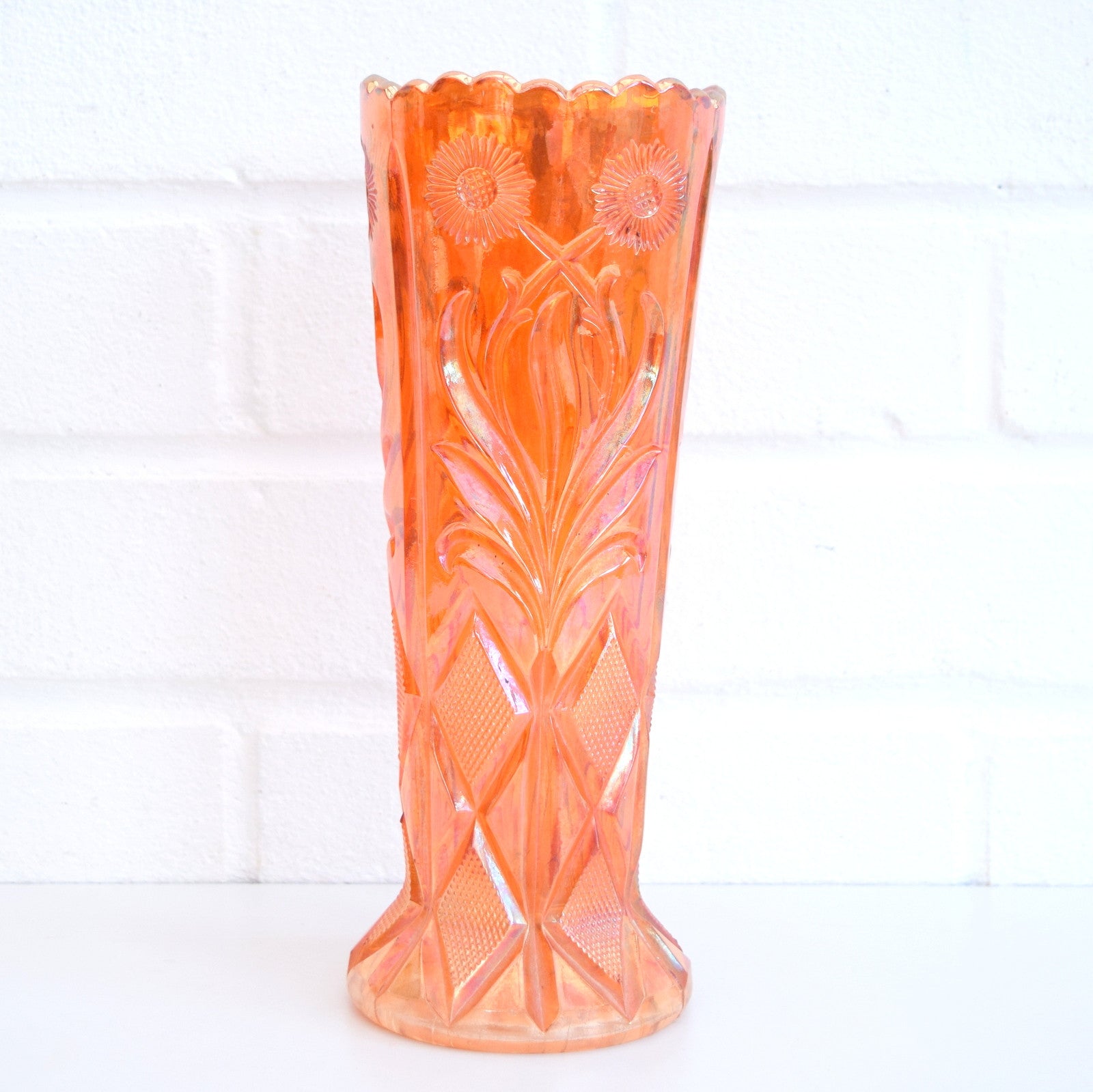 Vintage 1930s Carnival Glass Sunflower & Diamonds, Orange